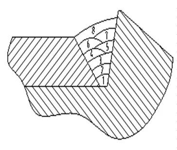 如果焊接焊腳尺寸大于12mm以上的焊件時,可采用三層六道、四層十道來完成, 如下圖所示。焊腳尺寸越大,焊接層數(shù)、道數(shù)就越多。