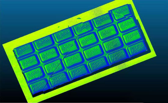 巧克力塊生產(chǎn)完整性檢測,aTiny激光位移傳感器可以實現(xiàn)檢查多排巧克力的輪廓,破裂和氣泡被識別,不合格的部分被分類。