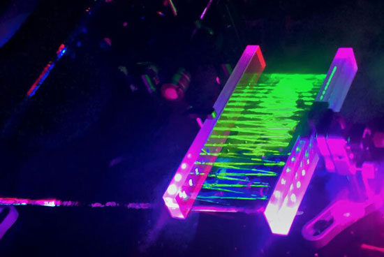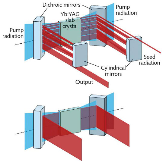 雖然皮秒和飛秒光纖激光器具有許多非凡的質(zhì)量,但是對于最高平均功率的超快光,人們必須轉(zhuǎn)向大體積固態(tài)激光器。研究人員不僅致力于克服超快激光功率限制,而且還致力于開發(fā)從脈沖產(chǎn)生到工藝技術(shù)以及實際應(yīng)用的整個工藝鏈中的技術(shù)。使用InnoSlab技術(shù)(兩個散熱器之間的矩形晶體,通過準直激光二極管縱向泵浦),已構(gòu)建了一種超快放大器,該放大器以500 kHz的頻率發(fā)射能量略大于1 mJ的壓縮脈沖,平均功率為530 W。使用充氣的Herriott型電池,研究人員已證明脈沖持續(xù)時間從590降低到30 fs,而能量損失不到5%。