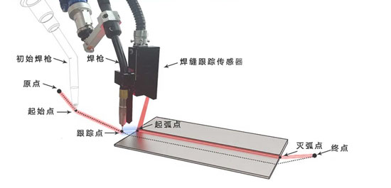 機(jī)器人焊縫跟蹤系統(tǒng)無(wú)需示教編程,尋位確定工件及焊縫的位置,修正真實(shí)焊縫的焊接起始位置,在焊接過(guò)程中啟動(dòng)實(shí)時(shí)跟蹤,通過(guò)實(shí)時(shí)的控制機(jī)器人不斷修正機(jī)器人的焊接軌跡,達(dá)到準(zhǔn)確的自動(dòng)焊接。
