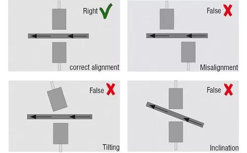 傳感器對(duì)準(zhǔn)必須特別注意安裝在對(duì)方對(duì)面的兩個(gè)傳感器的對(duì)準(zhǔn),不允許傳感器相對(duì)于目標(biāo)物體不對(duì)齊、傾斜。例如,當(dāng)偏差為1mm,傾斜度為2°時(shí),厚度測(cè)量誤差為35m。在目標(biāo)厚度為10 mm的情況下,這一誤差增加到41μm。