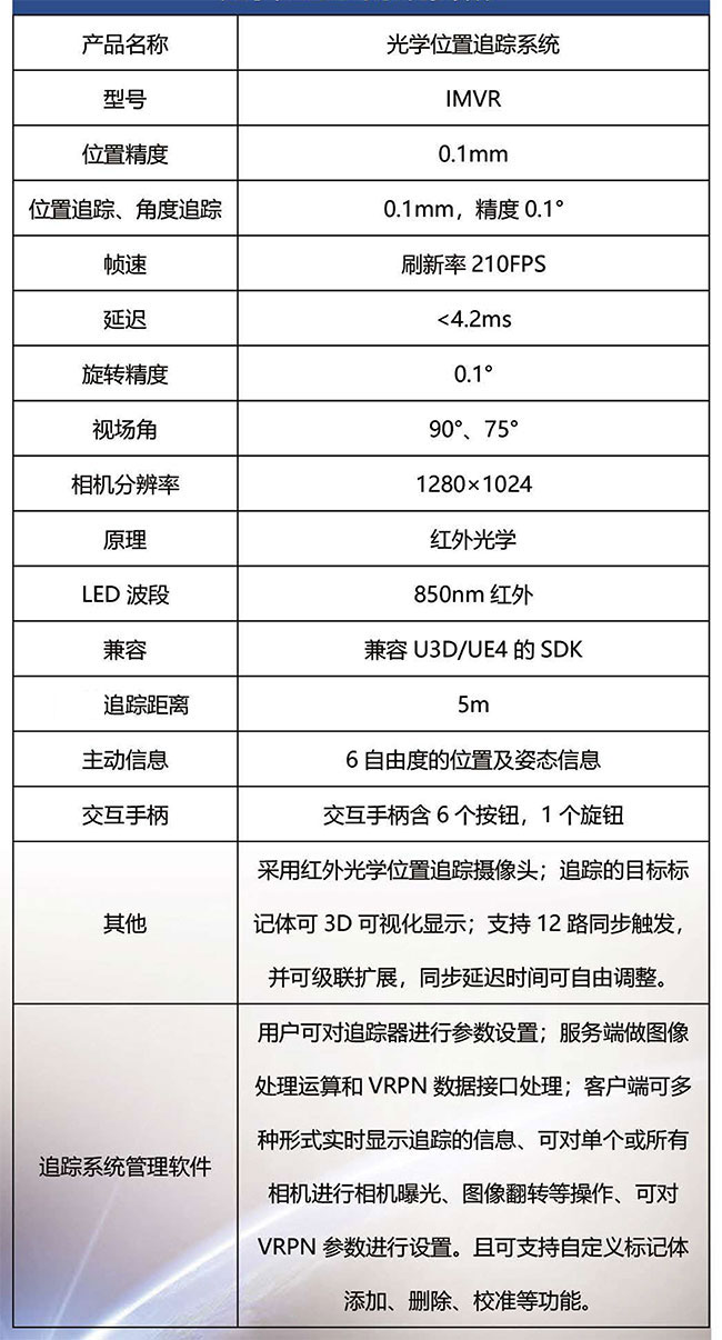 光學(xué)位置追蹤系統(tǒng)是專用于大場(chǎng)地、多人互動(dòng)的虛擬現(xiàn)實(shí)光學(xué)位置追蹤系統(tǒng),由VR系列智能攝像機(jī)、系統(tǒng)調(diào)試軟件、空間標(biāo)定套件、合作目標(biāo)套件、游戲引擎SDK包等組成。光學(xué)位置追蹤系統(tǒng)可滿足VR空間中人與虛擬場(chǎng)景的交互、人與人的交互、人與現(xiàn)場(chǎng)世界物體的交互,亞毫米級(jí)運(yùn)動(dòng)捕捉,低延時(shí)在4.2ms以內(nèi)。